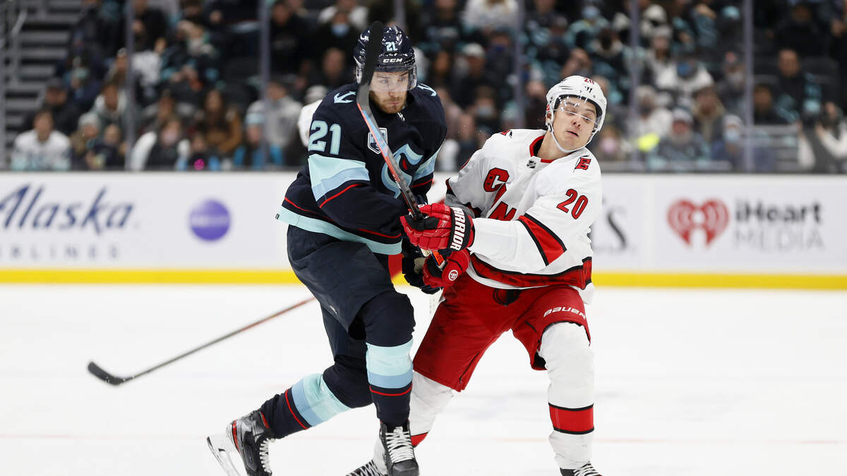 SEATTLE, WASHINGTON - NOVEMBER 24: Alex Wennberg #21 of the Seattle Kraken and Sebastian Aho #20 of the Carolina Hurricanes battle for the puck during the third period at Climate Pledge Arena on November 24, 2021 in Seattle, Washington. (Photo by Steph Chambers/Getty Images)