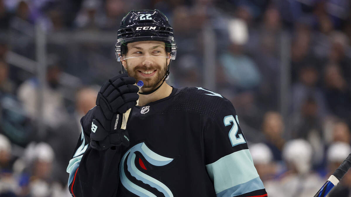 SEATTLE, WASHINGTON - OCTOBER 19: Oliver Bjorkstrand #22 of the Seattle Kraken looks on during the second period against the St. Louis Blues at Climate Pledge Arena on October 19, 2022 in Seattle, Washington. (Photo by Steph Chambers/Getty Images)