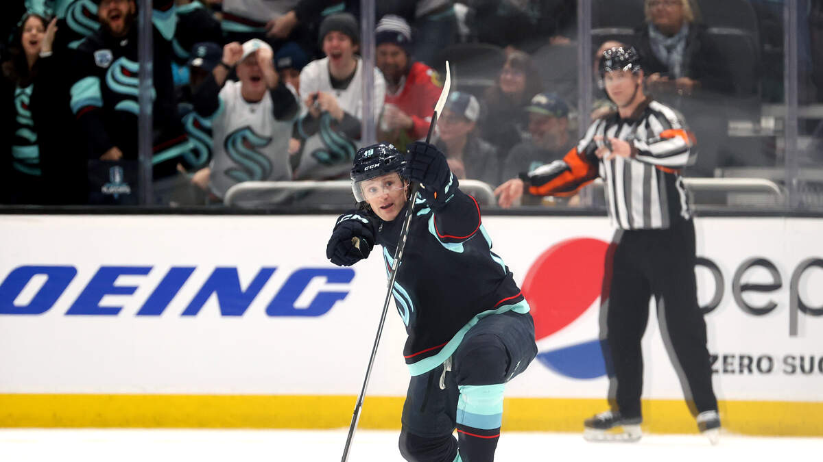 SEATTLE, WASHINGTON - APRIL 08: Jared McCann #19 of the Seattle Kraken celebrates his goal during the third period against the Chicago Blackhawks at Climate Pledge Arena on April 08, 2023 in Seattle, Washington. (Photo by Steph Chambers/Getty Images)