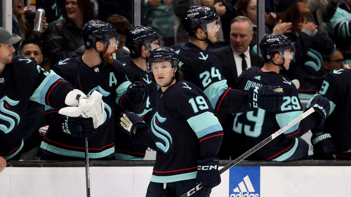SEATTLE, WASHINGTON - APRIL 03: Jared McCann #19 of the Seattle Kraken celebrates his shorthanded goal during the first period against the Arizona Coyotes at Climate Pledge Arena on April 03, 2023 in Seattle, Washington. (Photo by Steph Chambers/Getty Images)