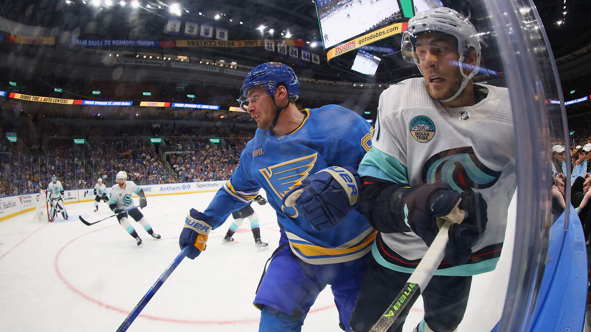ST LOUIS, MISSOURI - OCTOBER 14: Pavel Buchnevich #89 of the St. Louis Blues checks Alex Wennberg #21 of the Seattle Kraken in the first period at Enterprise Center on October 14, 2023 in St Louis, Missouri. (Photo by Dilip Vishwanat/Getty Images)
