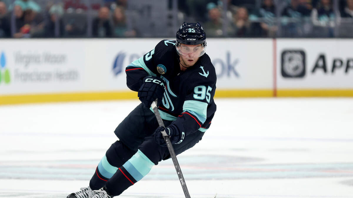 SEATTLE, WASHINGTON - OCTOBER 19: Andre Burakovsky #95 of the Seattle Kraken skates against the Carolina Hurricanes during the second period at Climate Pledge Arena on October 19, 2023 in Seattle, Washington. (Photo by Steph Chambers/Getty Images)