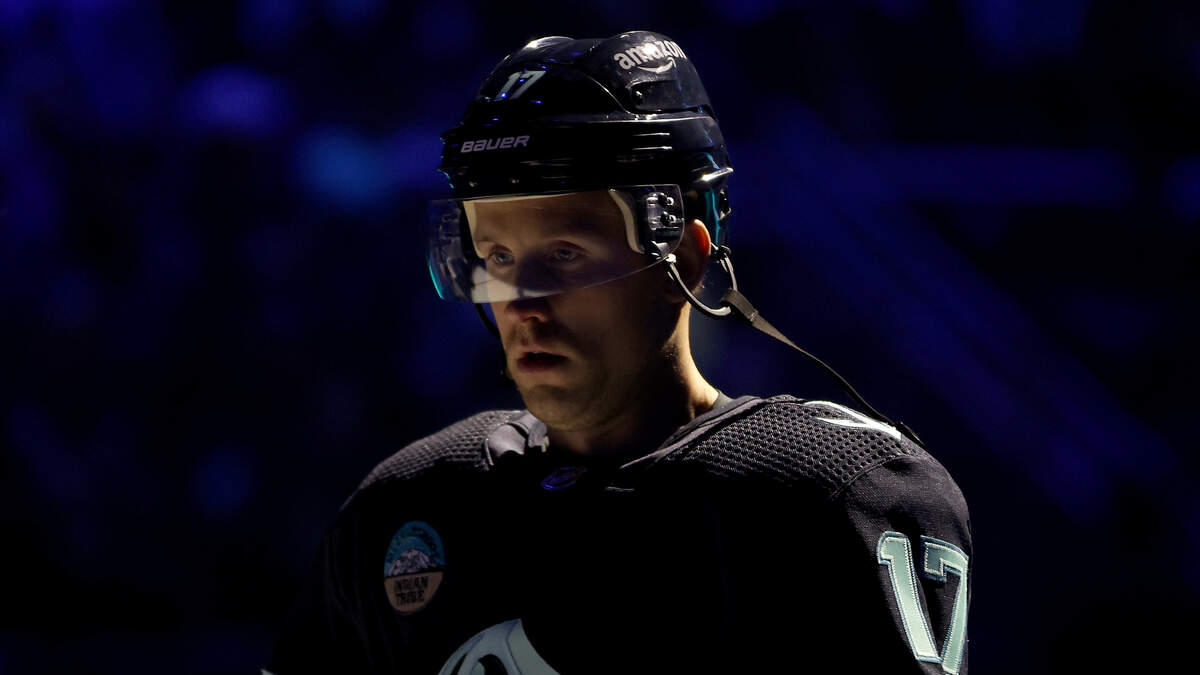 SEATTLE, WASHINGTON - MARCH 02: Jaden Schwartz #17 of the Seattle Kraken looks on before the game against the Edmonton Oilers at Climate Pledge Arena on March 02, 2024 in Seattle, Washington. (Photo by Steph Chambers/Getty Images)
