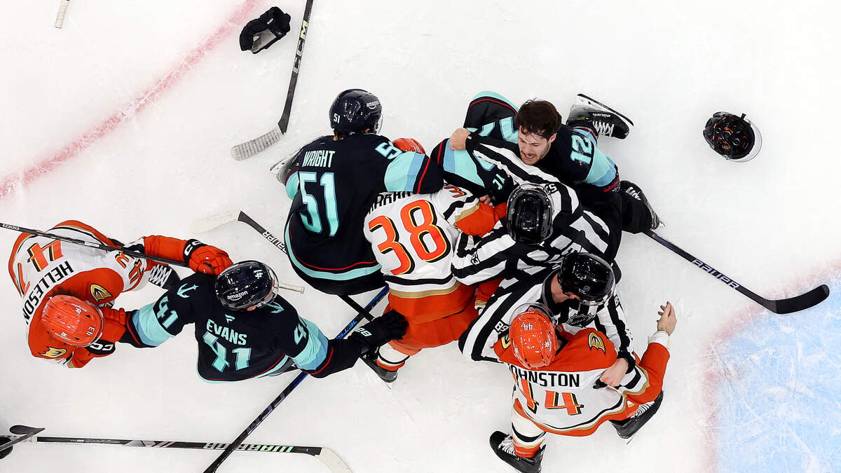 SEATTLE, WASHINGTON - NOVEMBER 27: Members of the Seattle Kraken and the Anaheim Ducks scuffle during the third period at Climate Pledge Arena on November 27, 2024 in Seattle, Washington. (Photo by Steph Chambers/Getty Images)