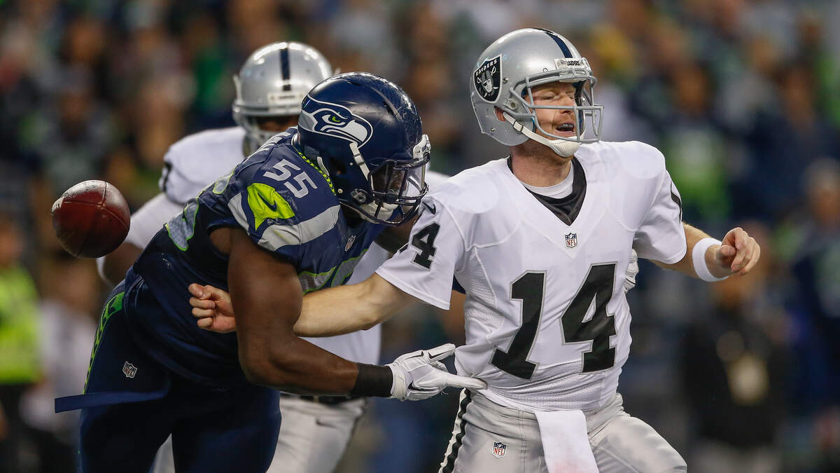 Photo Credit: SEATTLE, WA - SEPTEMBER 03: Quarterback Matt McGloin #14 of the Oakland Raiders is sacked in the end zone by defensive end Frank Clark #55 of the Seattle Seahawks at CenturyLink Field on September 3, 2015 i Seattle, Washington. The Seahawks recovered the fumble on the play resulting in a touchdown. (Photo by Otto Greule Jr/Getty Images)
