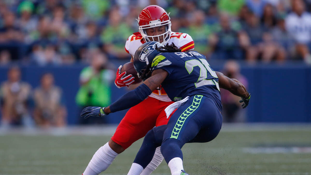 Photo Credit: SEATTLE, WA - AUGUST 25: Wide receiver Albert Wilson #12 of the Kansas City Chiefs is tackled by cornerback Richard Sherman #25 of the Seattle Seahawks at CenturyLink Field on August 25, 2017 in Seattle, Washington. (Photo by Otto Greule Jr/Getty Images)