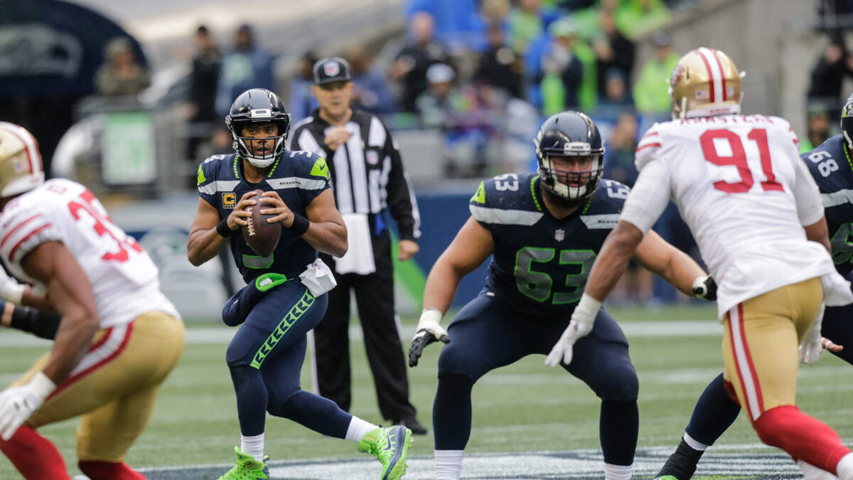 Photo Credit: SEATTLE, WA - SEPTEMBER 17: Quarterback Russell Wilson #3 of the Seattle Seahawks looks downfield to pass during the third quarter of the game against the San Francisco 49ers at CenturyLink Field on September 17, 2017 in Seattle, Washington. (Photo by Stephen Brashear/Getty Images)
