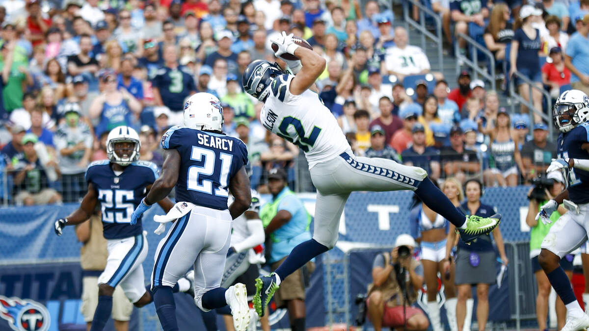Photo Credit: NASHVILLE, TN - SEPTEMBER 24: Tight End Luke Willson #82 of the Seattle Seahawks makes a catch for a touchdown against Tennessee Titans at Nissan Stadium on September 24, 2017 in Nashville, Tennessee. (Photo by Wesley Hitt/Getty Images)