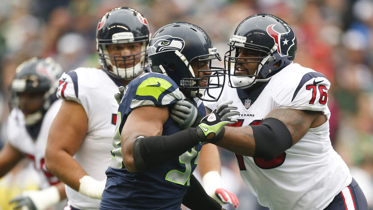Photo Credit: SEATTLE, WA - OCTOBER 29: Defensive end Dwight Freeney #93 of the Seattle Seahawks blocks tackle Duane Brown #76 of the Houston Texans during the first quarter of the game at CenturyLink Field on October 29, 2017 in Seattle, Washington. (Photo by Otto Greule Jr/Getty Images)