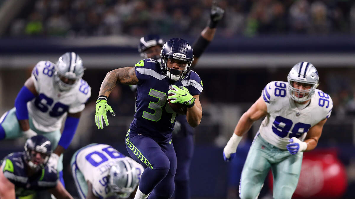 Photo credit: ARLINGTON, TX - DECEMBER 24: Thomas Rawls #34 of the Seattle Seahawks carries the ball against the Dallas Cowboys in the second half of a football game at AT&T Stadium on December 24, 2017 in Arlington, Texas. (Photo by Tom Pennington/Getty Images)
