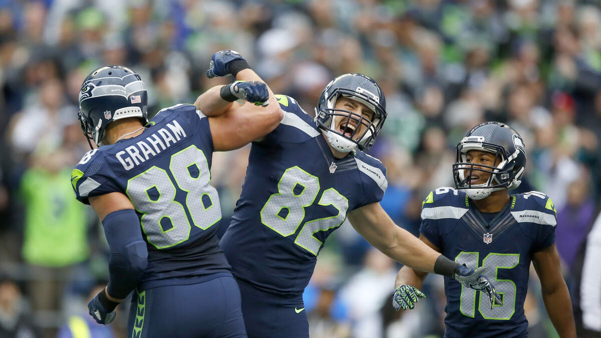 Photo Credit: SEATTLE, WA - NOVEMBER 20: Tight end Jimmy Graham #88 of the Seattle Seahawks celebrates his touchdown with teammate Tight end Luke Willson #82 against the Philadelphia Eagles at CenturyLink Field on November 20, 2016 in Seattle, Washington. (Photo by Otto Greule Jr/Getty Images)