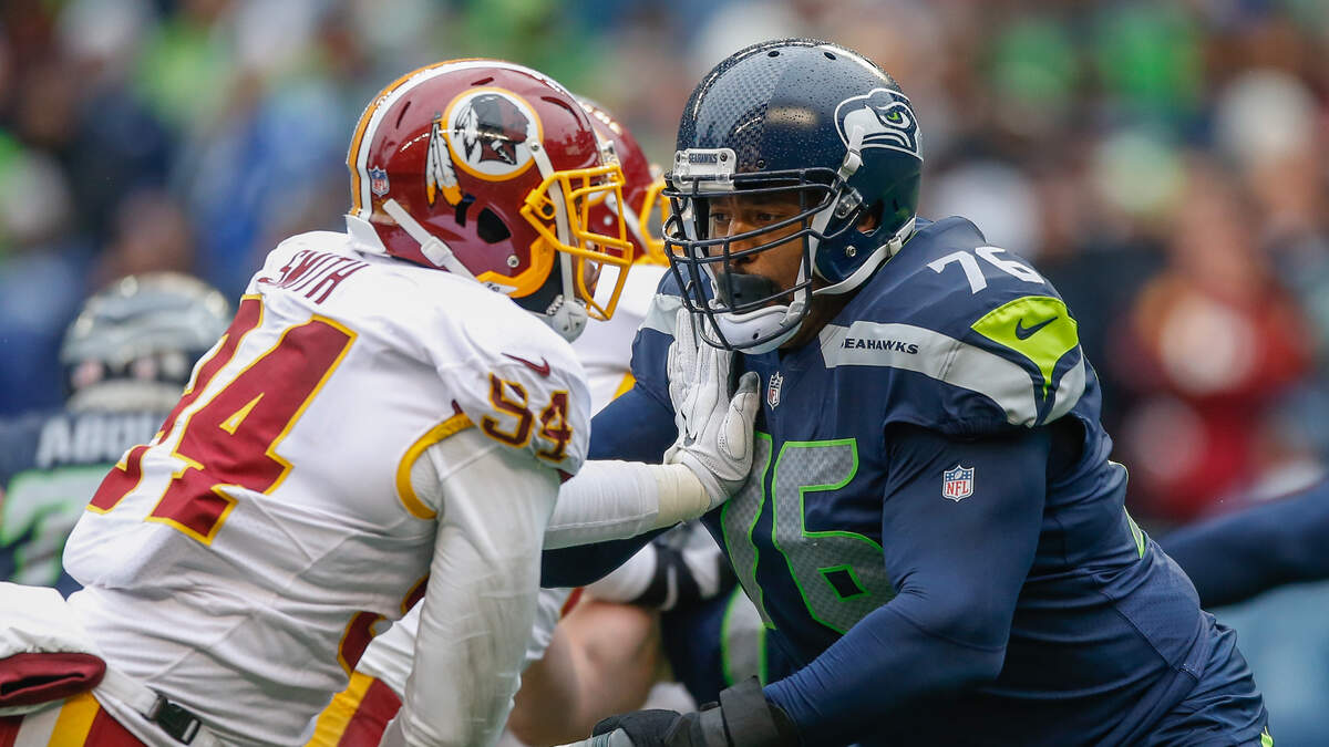 Photo Credit: SEATTLE, WA - NOVEMBER 05: Offensive tackle Duane Brown #76 of the Seattle Seahawks pass blocks against linebacker Mason Foster #54 of the Washington Redskins at CenturyLink Field on November 5, 2017 in Seattle, Washington. The Redskins beat the Seahawks 17-14. (Photo by Otto Greule Jr/Getty Images)