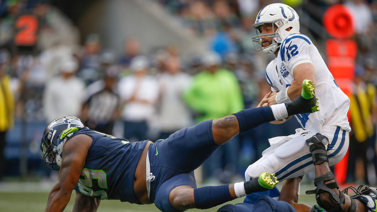 Photo Credit: SEATTLE, WA - AUGUST 09: Quarterback Andrew Luck #12 of the Indianapolis Colts is sacked by defensive end Rasheem Green #94 (R) of the Seattle Seahawks at CenturyLink Field on August 9, 2018 in Seattle, Washington. (Photo by Otto Greule Jr/Getty Images)