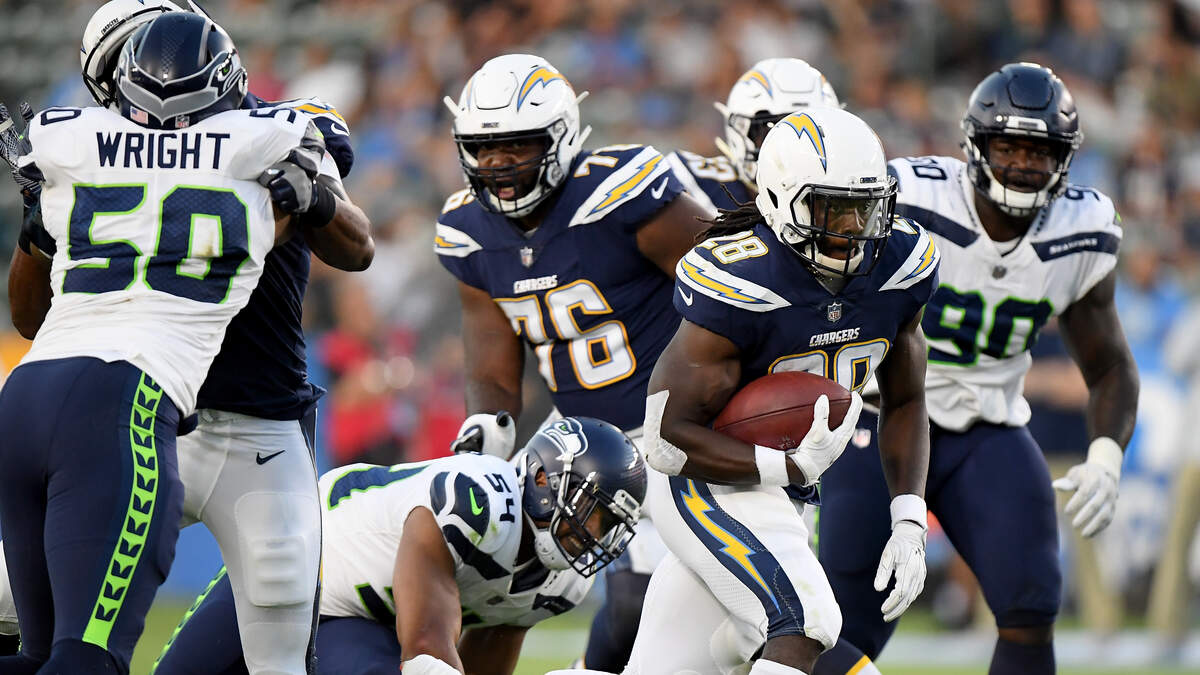 Photo Credit: CARSON, CA - AUGUST 18: Melvin Gordon #28 of the Los Angeles Chargers breaks through a hole in the Seattle Seahawks defense during a presseason game at StubHub Center on August 18, 2018 in Carson, California. (Photo by Harry How/Getty Images)