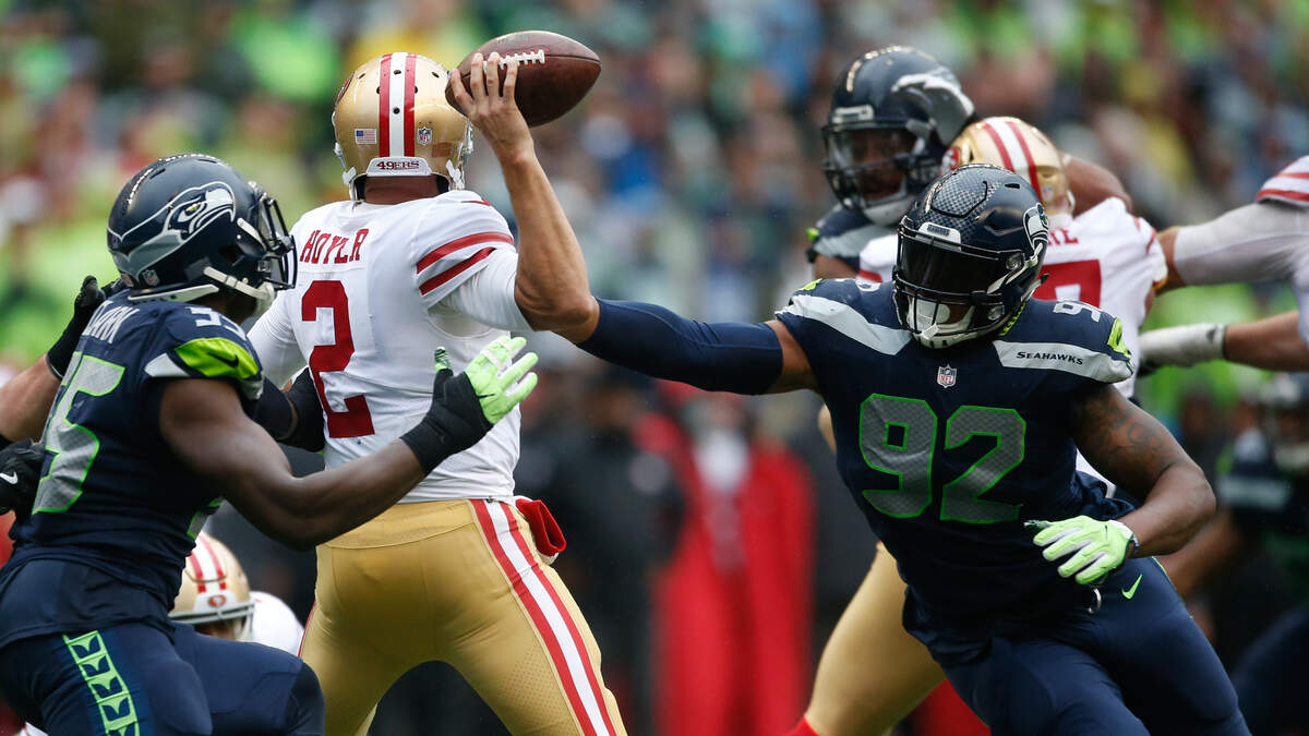 Photo Credit: SEATTLE, WA - SEPTEMBER 17: Defensive tackle Nazair Jones #92 pressures quarterback Brian Hoyer #2 of the San Francisco 49ers during the third quarter of the game at CenturyLink Field on September 17, 2017 in Seattle, Washington. (Photo by Otto Greule Jr/Getty Images)