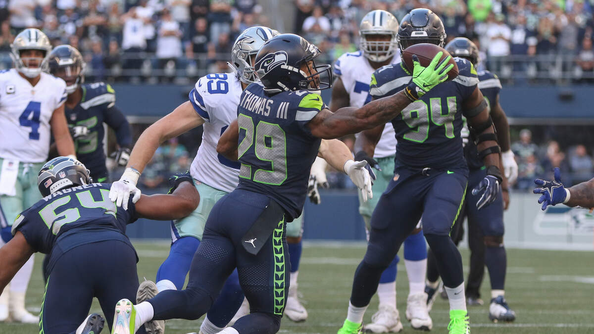 Photo Credit: SEATTLE, WA - SEPTEMBER 23: Free safety Earl Thomas #29 of the Seattle Seahawks intercepts a pass against tight end Blake Jarwin #89 of the Dallas Cowboys in the fourth quarter at CenturyLink Field on September 23, 2018 in Seattle, Washington. (Photo by Otto Greule Jr/Getty Images)