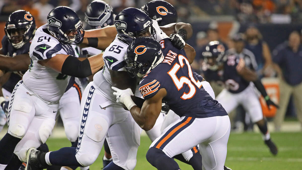 Photo Credit: CHICAGO, IL - SEPTEMBER 17: Khalil Mack #52 of the Chicago Bears rushes against Germain Ifedi #65 of the Seattle Seahawks at Soldier Field on September 17, 2018 in Chicago, Illinois. The Bears defeated the Seahawks 24-17. (Photo by Jonathan Daniel/Getty Images)