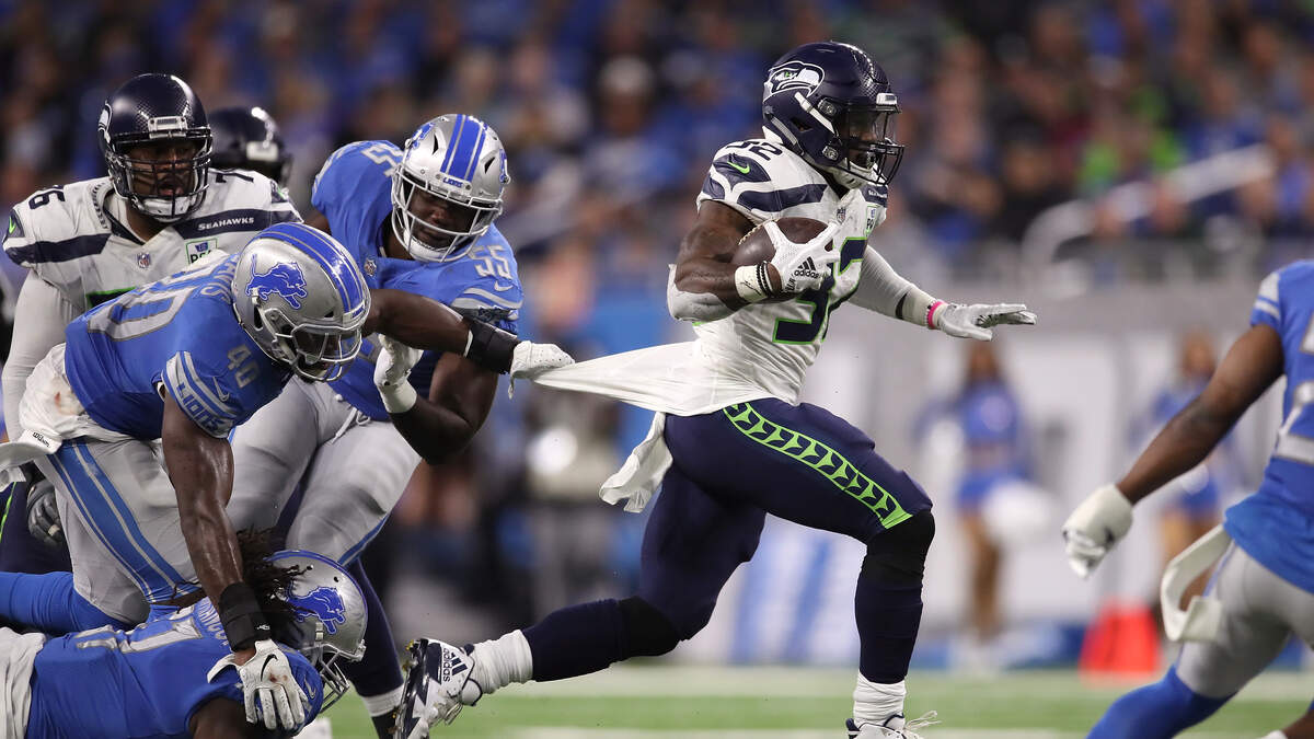 Photo Credit: DETROIT, MI - OCTOBER 28: Chris Carson #32 of the Seattle Seahawks looks to run the ball against Jarrad Davis #40 of the Detroit Lions and Eric Lee #55 during the first half at Ford Field on October 28, 2018 in Detroit, Michigan. (Photo by Gregory Shamus/Getty Images)
