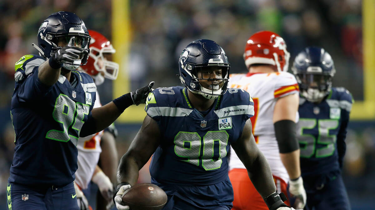 Photo Credit: SEATTLE, WA - DECEMBER 23: Jarran Reed #90 of the Seattle Seahawks celebrates after a fumble recovery with teammate Dion Jordan #95 during the second quarter of the game against the Kansas City Chiefs at CenturyLink Field on December 23, 2018 in Seattle, Washington. (Photo by Otto Greule Jr/Getty Images)