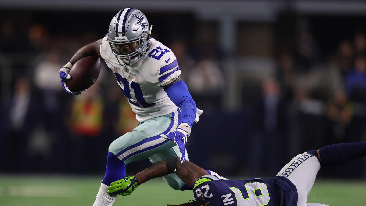 Photo Credit: ARLINGTON, TEXAS - JANUARY 05: Ezekiel Elliott #21 of the Dallas Cowboys breaks a tackle attempt by Shaquill Griffin #26 of the Seattle Seahawks in the fourth quarter during the Wild Card Round at AT&T Stadium on January 05, 2019 in Arlington, Texas. (Photo by Tom Pennington/Getty Images)