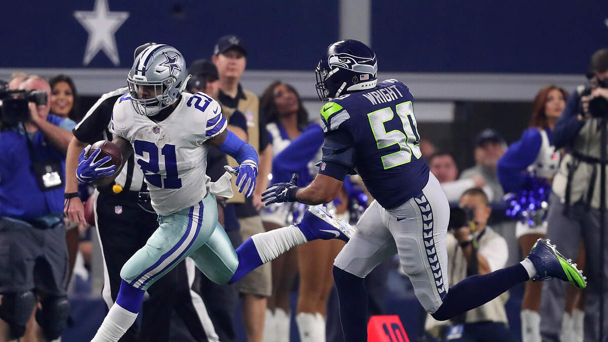 Photo Credit: ARLINGTON, TEXAS - JANUARY 05: Ezekiel Elliott #21 of the Dallas Cowboys is pursued by #50 of the Seattle Seahawks in the first half during the Wild Card Round at AT&T Stadium on January 05, 2019 in Arlington, Texas. (Photo by Tom Pennington/Getty Images)