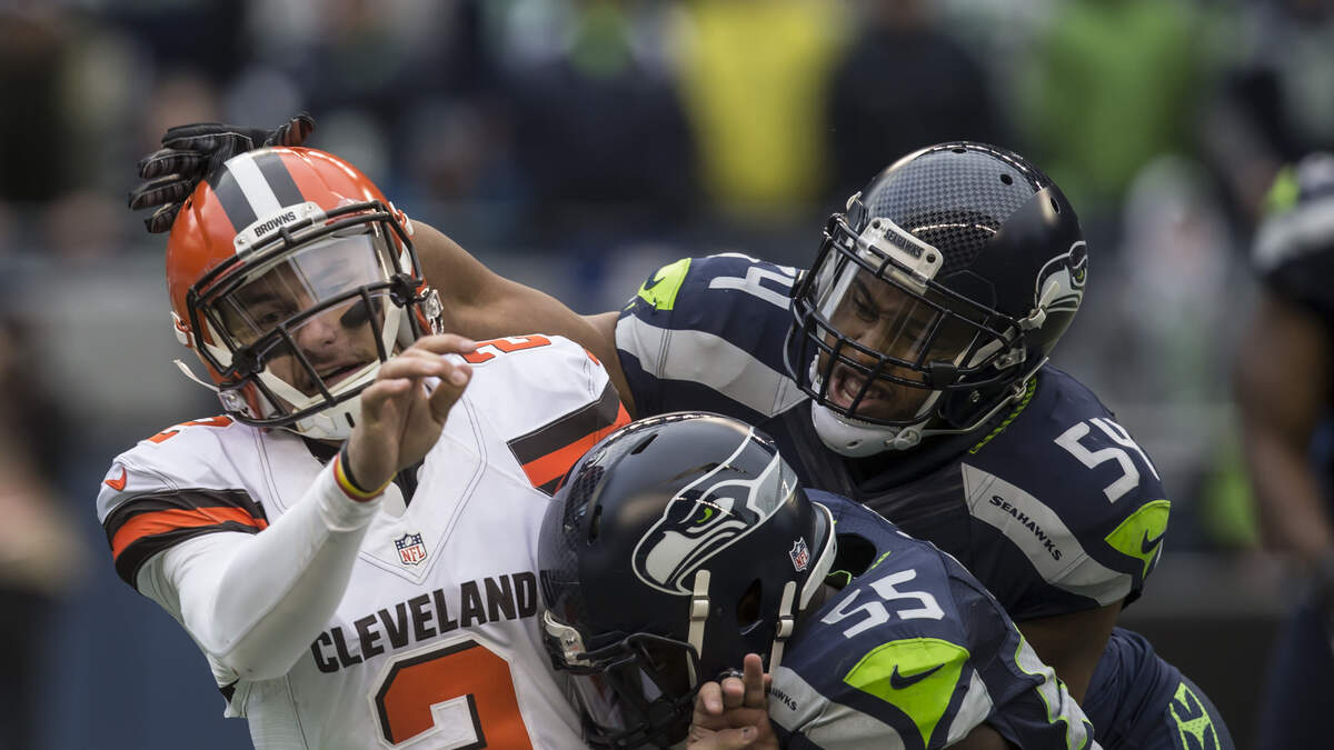 Photo Credit: SEATTLE, WA - DECEMBER 20: Defensive lineman Frank Clark #55 of the Seattle Seahawks linebacker Bobby Wagner #54 of the Seattle Seahawks hit quarterback Johnny Manziel #2 of the Seattle Seahawks during the first half of play at CenturyLink Field on December 20, 2015 in Seattle, Washington. The Seahawks won the game 30-13. (Photo by Stephen Brashear/Getty Images)