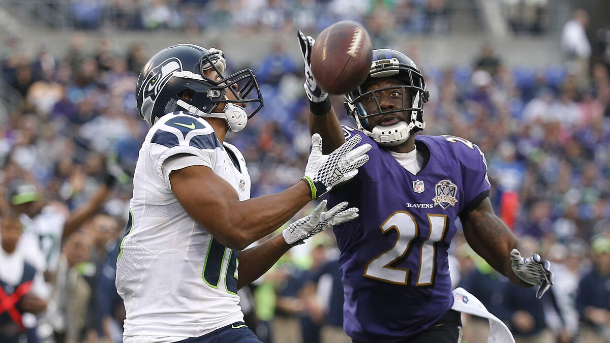 - Ravens punt. Seahawks drive into field goal range. On 3rd down, Russell Wilson finds D.K. f again. Play is reviewed and upheld. He gets both feet in bounds. Second touchdown of the day, ninth of the season. 21-0 Seattle, still in the first quarter.