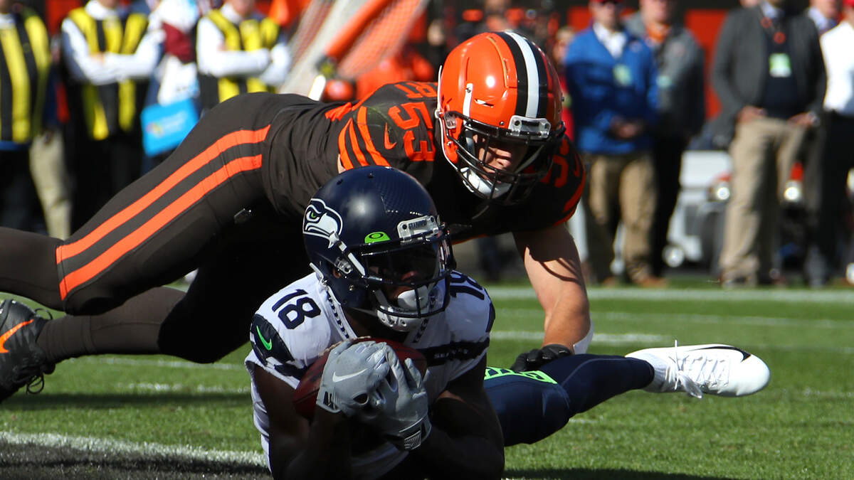 Photo Credit: CLEVELAND, OHIO - OCTOBER 13: Jaron Brown #18 of the Seattle Seahawks catches a third quarter touchdown in front of Joe Schobert #53 of the Cleveland Browns at FirstEnergy Stadium on October 13, 2019 in Cleveland, Ohio. (Photo by Gregory Shamus/Getty Images)