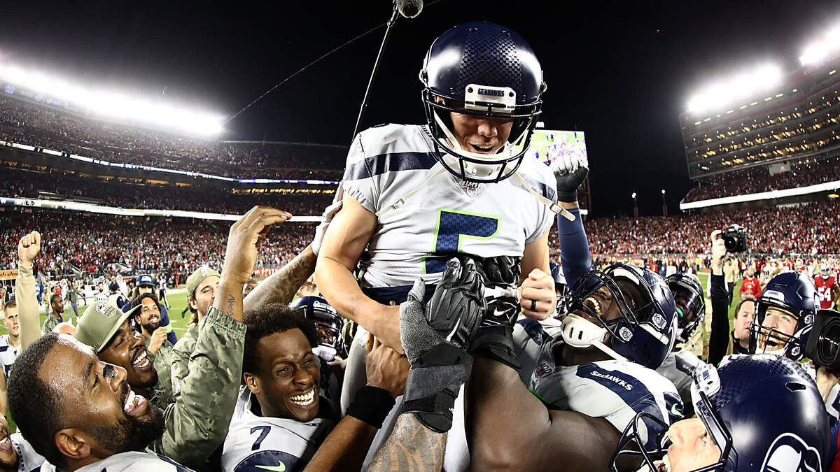 Photo Credit: SANTA CLARA, CALIFORNIA - NOVEMBER 11: Kicker Jason Myers #5 of the Seattle Seahawks is carried off the field after making the winning 42 yard field goal in overtime to win 27-24 over the San Francisco 49ers at Levi's Stadium on November 11, 2019 in Santa Clara, California. (Photo by Ezra Shaw/Getty Images)