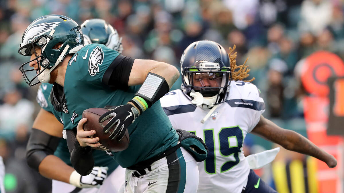 Photo Credit: PHILADELPHIA, PENNSYLVANIA - NOVEMBER 24: Carson Wentz #11 of the Philadelphia Eagles scrambles as Shaquem Griffin #49 of the Seattle Seahawks defends in the fourth quarter at Lincoln Financial Field on November 24, 2019 in Philadelphia, Pennsylvania.The Seattle Seahawks defeated the Philadelphia Eagles 17-9. (Photo by Elsa/Getty Images)