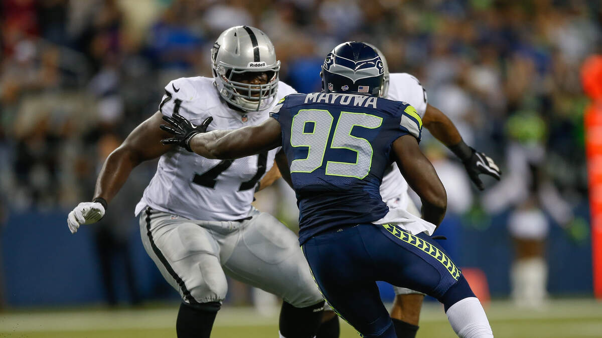 Photo Credit: SEATTLE, WA - AUGUST 29: Tackle Menelik Watson of the Oakland Raiders pass blocks against defensive end Benson Mayowa #95 of the Seattle Seahawks at CenturyLink Field on August 29, 2013 in Seattle, Washington. The Seahawks defeated the Raiders 22-6. (Photo by Otto Greule Jr/Getty Images)