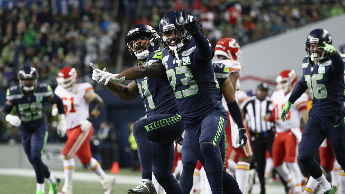 Photo Credit: SEATTLE, WA - DECEMBER 23: J.D. McKissic #21 and Neiko Thorpe #23 of the Seattle Seahawks celebrate a big hit in the kick off return during the third quarter of the game against the Kansas City Chiefs at CenturyLink Field on December 23, 2018 in Seattle, Washington. (Photo by Abbie Parr/Getty Images)