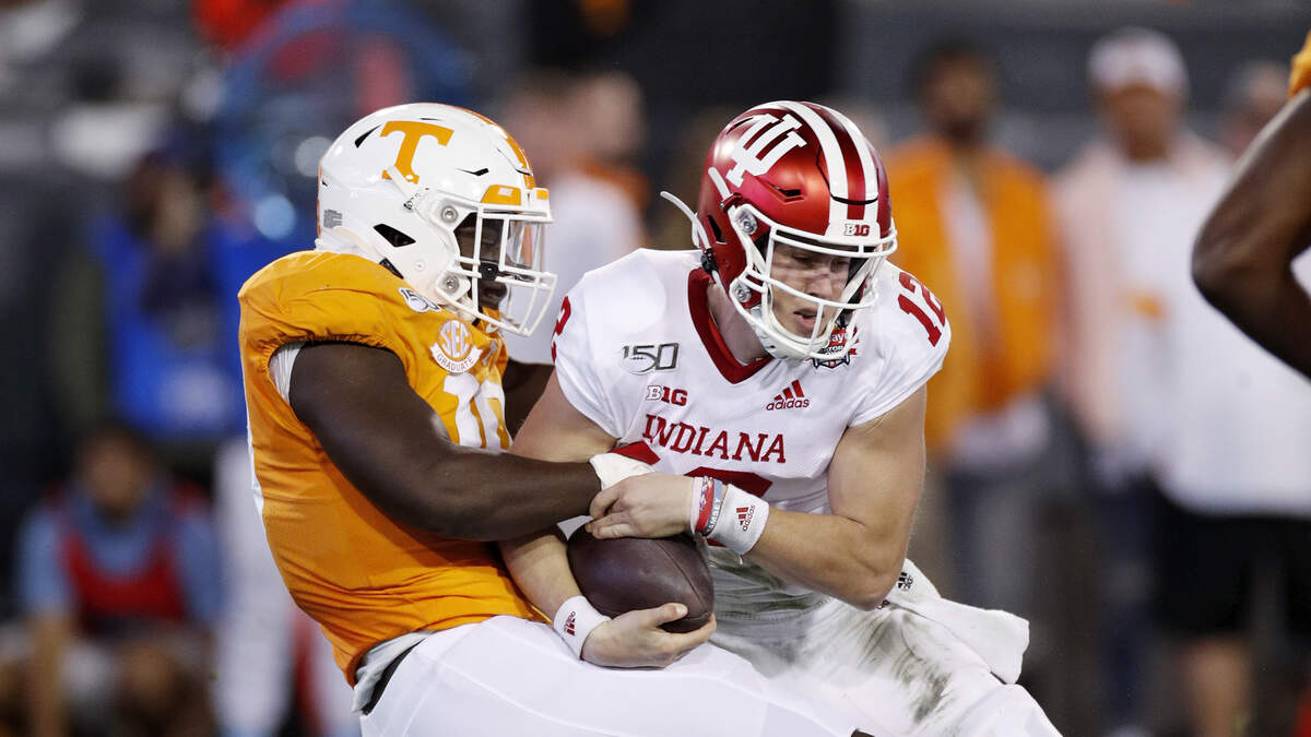 Photo Credit: JACKSONVILLE, FL - JANUARY 02: Darrell Taylor #19 of the Tennessee Volunteers tackles Peyton Ramsey #12 of the Indiana Hoosiers in the first half of the TaxSlayer Gator Bowl at TIAA Bank Field on January 2, 2020 in Jacksonville, Florida. (Photo by Joe Robbins/Getty Images)