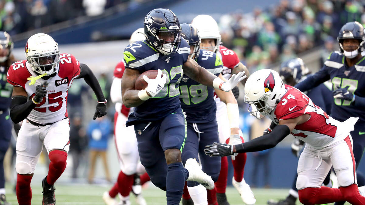 Photo Credit: SEATTLE, WASHINGTON - DECEMBER 22: Running back Chris Carson #32 of the Seattle Seahawks carries the ball against the defense of strong safety Jalen Thompson #34 of the Arizona Cardinals during the game at CenturyLink Field on December 22, 2019 in Seattle, Washington. (Photo by Abbie Parr/Getty Images)
