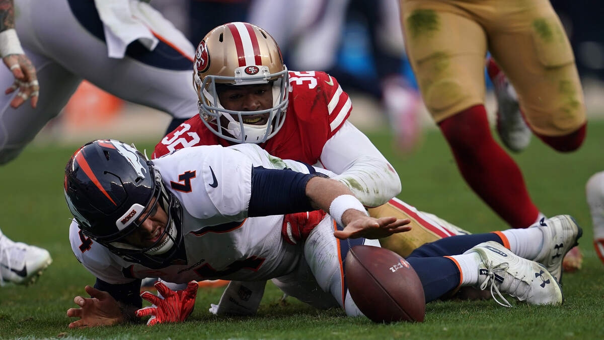 Photo Credit: SANTA CLARA, CA - DECEMBER 09: Case Keenum #4 of the Denver Broncos recovers his fumble after a hit by D.J. Reed #32 of the San Francisco 49ers during their NFL game at Levi's Stadium on December 9, 2018 in Santa Clara, California. (Photo by Robert Reiners/Getty Images)