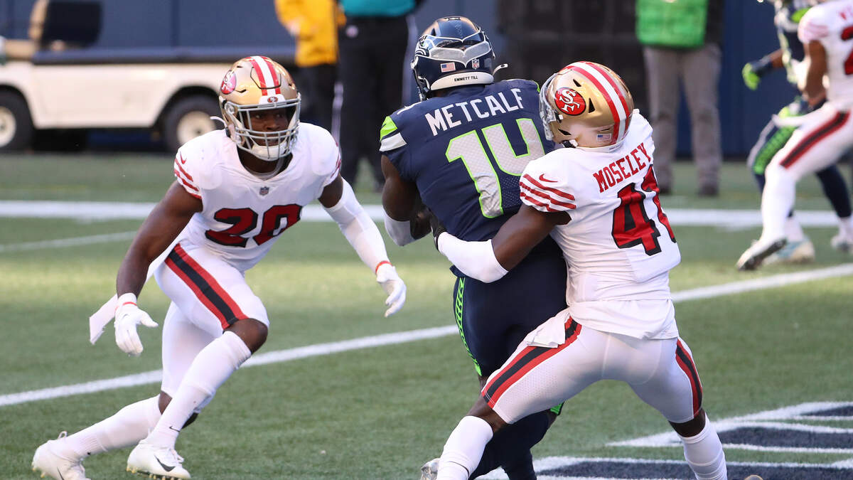 Photo Credit: SEATTLE, WASHINGTON - NOVEMBER 01: DK Metcalf #14 of the Seattle Seahawks scores a touchdown against Emmanuel Moseley #41 and Jimmie Ward #20 of the San Francisco 49ers in the second quarter of the game at CenturyLink Field on November 01, 2020 in Seattle, Washington. (Photo by Abbie Parr/Getty Images)