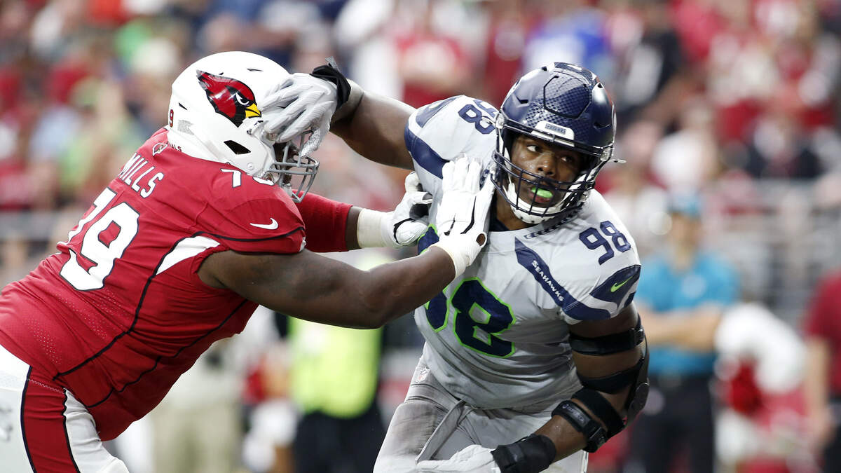 Photo Credit: GLENDALE, ARIZONA - SEPTEMBER 29: Defensive end Rasheem Green #98 of the Seattle Seahawks battles through the block of offensive lineman Jordan Mills #79 of the Arizona Cardinals during the second half of the NFL football game at State Farm Stadium on September 29, 2019 in Glendale, Arizona. (Photo by Ralph Freso/Getty Images)