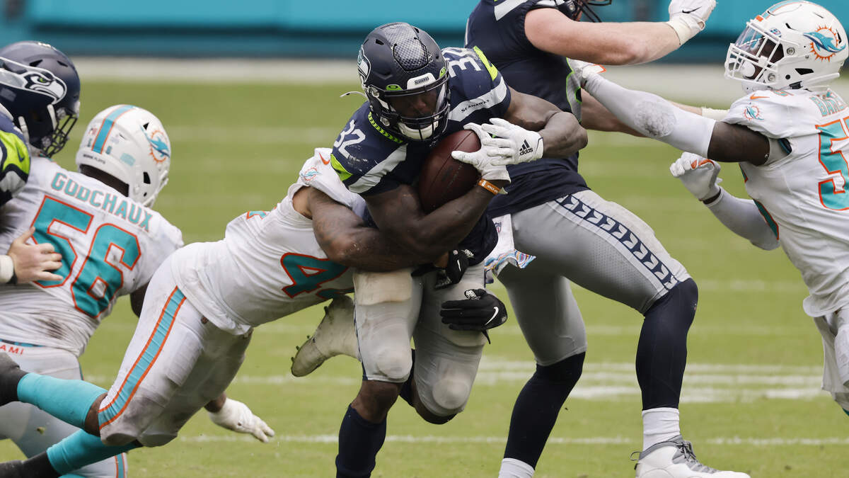 Photo Credit: MIAMI GARDENS, FLORIDA - OCTOBER 04: Chris Carson #32 of the Seattle Seahawks runs with the ball against the Miami Dolphins during the second half at Hard Rock Stadium on October 04, 2020 in Miami Gardens, Florida. (Photo by Michael Reaves/Getty Images)