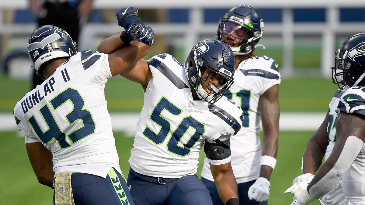 Photo Credit: INGLEWOOD, CALIFORNIA - NOVEMBER 15: Carlos Dunlap II #43 and K.J. Wright #50 of the Seattle Seahawks warm up prior to their game against the Los Angeles Rams at SoFi Stadium on November 15, 2020 in Inglewood, California. (Photo by Kevork Djansezian/Getty Images)