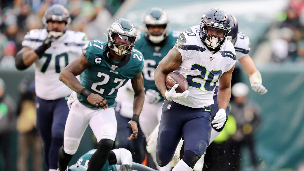 Photo Credit: PHILADELPHIA, PENNSYLVANIA - NOVEMBER 24: Rashaad Penny #20 of the Seattle Seahawks runs the ball for touchdown in the fourth quarter as Ronald Darby #21Malcolm Jenkins #27 of the Philadelphia Eagles defends at Lincoln Financial Field on November 24, 2019 in Philadelphia, Pennsylvania.The Seattle Seahawks defeated the Philadelphia Eagles 17-9. (Photo by Elsa/Getty Images)