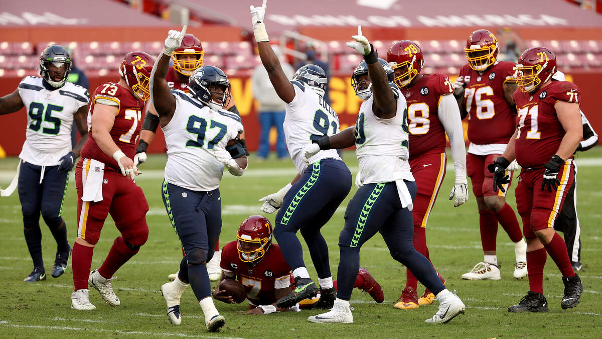 Photo Credit: LANDOVER, MARYLAND - DECEMBER 20: The Seattle Seahawks defense celebrates after sacking quarterback Dwayne Haskins #7 of the Washington Football Team in the second half at FedExField on December 20, 2020 in Landover, Maryland. (Photo by Patrick Smith/Getty Images)