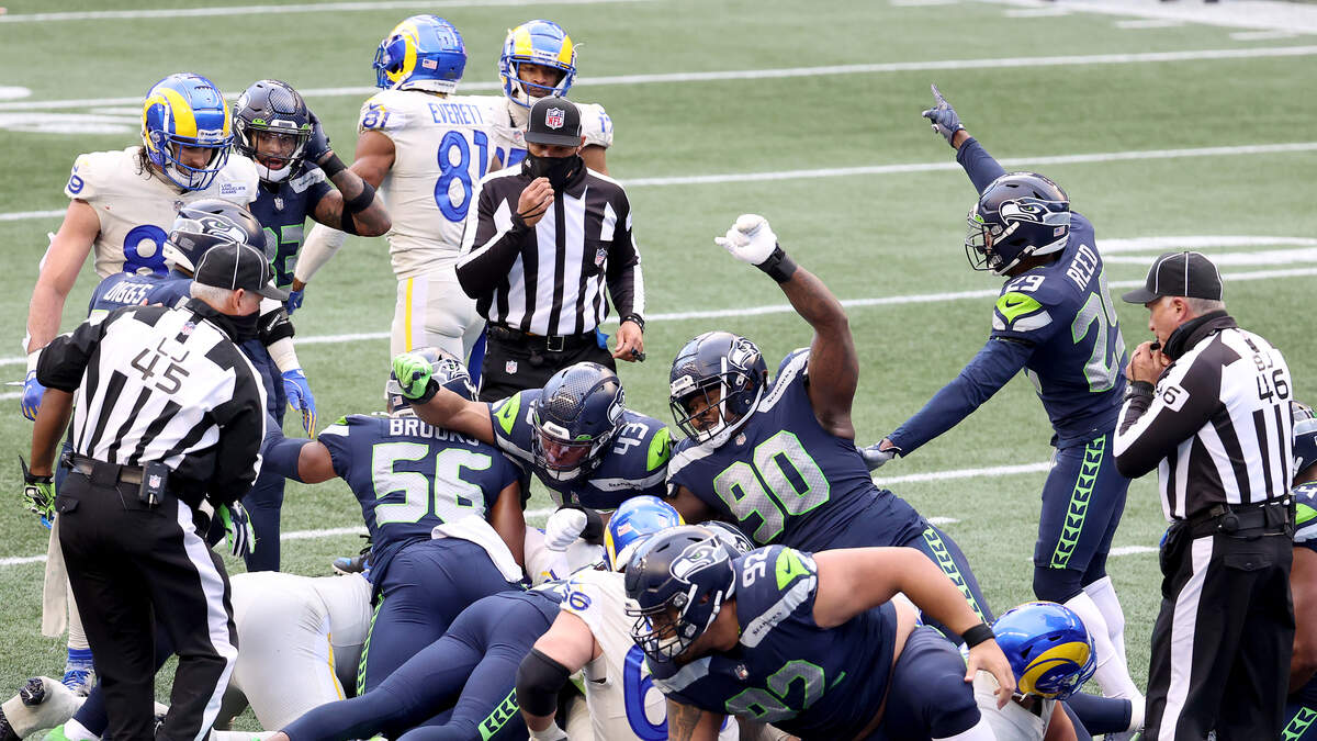 Photo Credit: SEATTLE, WASHINGTON - DECEMBER 27: The Seattle Seahawks defense celebrates a stop on third down against the Los Angeles Rams during the third quarter at Lumen Field on December 27, 2020 in Seattle, Washington. (Photo by Abbie Parr/Getty Images)