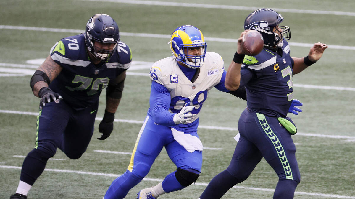Photo Credit: SEATTLE, WASHINGTON - JANUARY 09: Aaron Donald #99 of the Los Angeles Rams pressures Russell Wilson #3 of the Seattle Seahawks during the third quarter in an NFC Wild Card game at Lumen Field on January 09, 2021 in Seattle, Washington. (Photo by Steph Chambers/Getty Images)