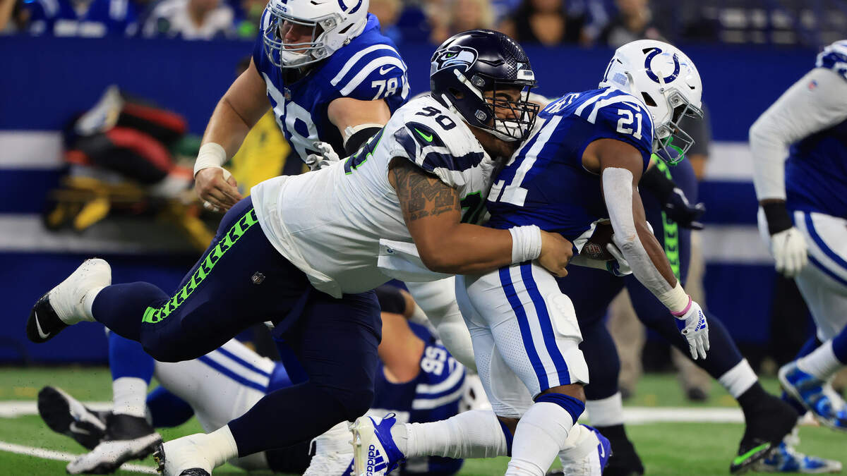 Photo Credit: INDIANAPOLIS, INDIANA - SEPTEMBER 12: Seattle Seahawks nose tackle Bryan Mone #90 tackles Indianapolis Colts running back Nyheim Hines #21 during the second half at Lucas Oil Stadium on September 12, 2021 in Indianapolis, Indiana. (Photo by Justin Casterline/Getty Images)