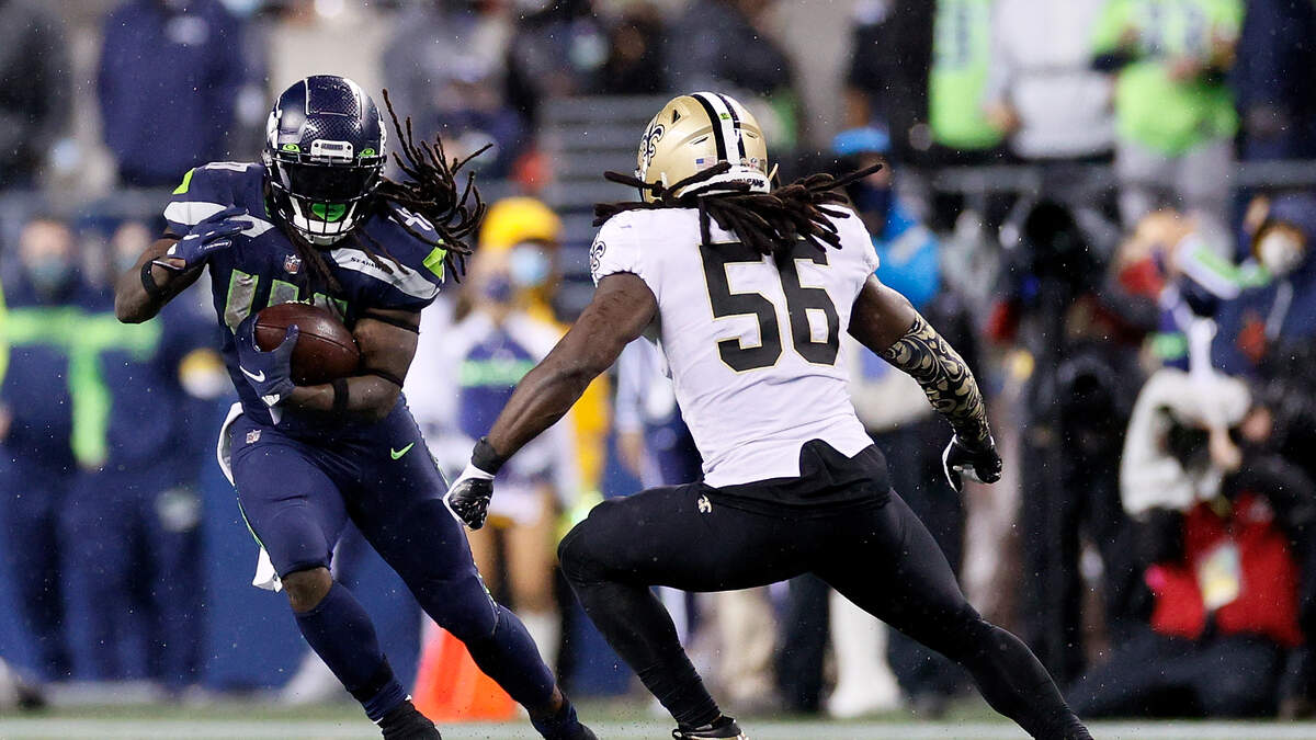 Photo Credit: SEATTLE, WASHINGTON - OCTOBER 25: Alex Collins #41 of the Seattle Seahawks is pursued by Demario Davis #56 of the New Orleans Saints during the second half at Lumen Field on October 25, 2021 in Seattle, Washington. (Photo by Steph Chambers/Getty Images)
