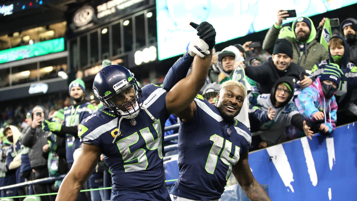 SEATTLE, WASHINGTON - DECEMBER 05: Bobby Wagner #54 and DK Metcalf #14 of the Seattle Seahawks celebrate after defeating the San Francisco 49ers 30-23 at Lumen Field on December 05, 2021 in Seattle, Washington. (Photo by Steph Chambers/Getty Images)Photo: Getty Images