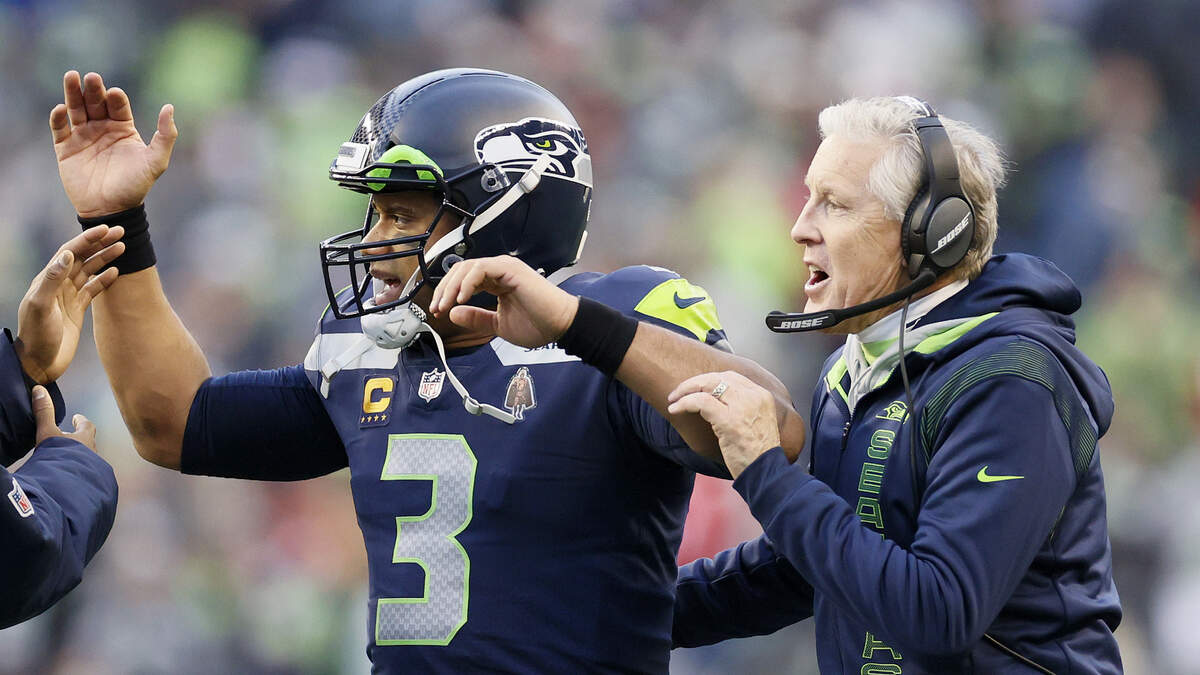 Photo Credit: SEATTLE, WASHINGTON - DECEMBER 05: Russell Wilson #3 and head coach Pete Carroll of the Seattle Seahawks react during the third quarter against the San Francisco 49ers at Lumen Field on December 05, 2021 in Seattle, Washington. (Photo by Steph Chambers/Getty Images)