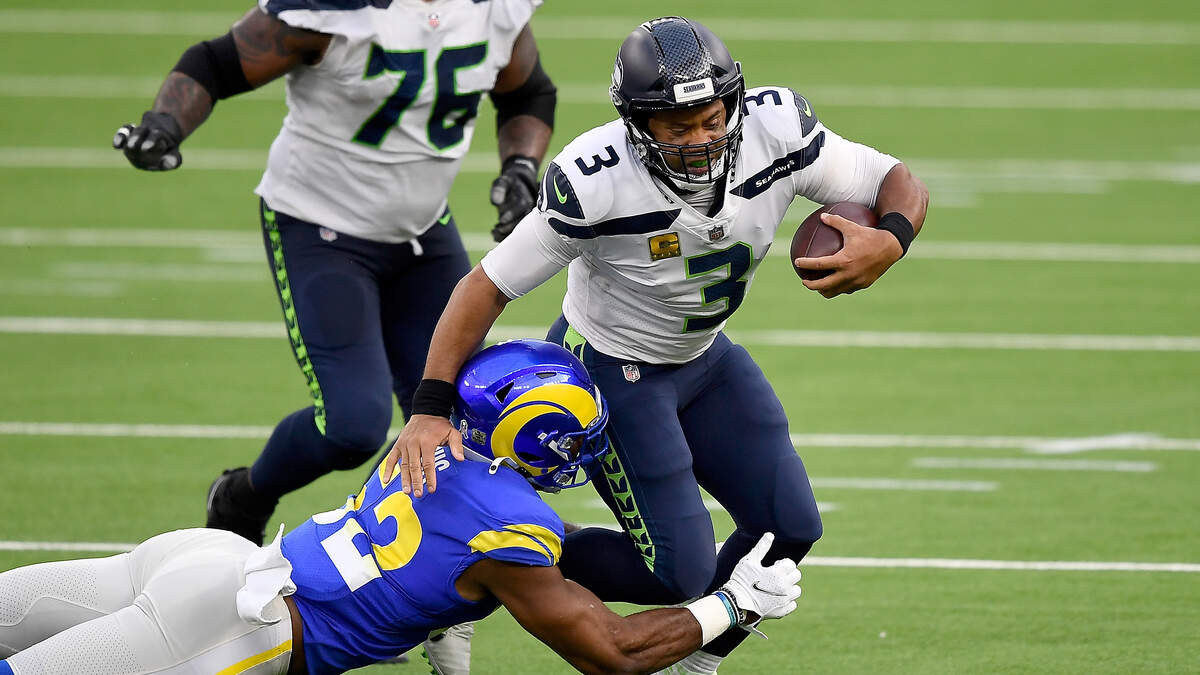 Photo Credit: INGLEWOOD, CALIFORNIA - NOVEMBER 15: Quarterback Russell Wilson #3 of the Seattle Seahawks is tackled by Terrell Lewis #52 of the Los Angeles Rams in the second quarter at SoFi Stadium on November 15, 2020 in Inglewood, California. (Photo by Kevork Djansezian/Getty Images)