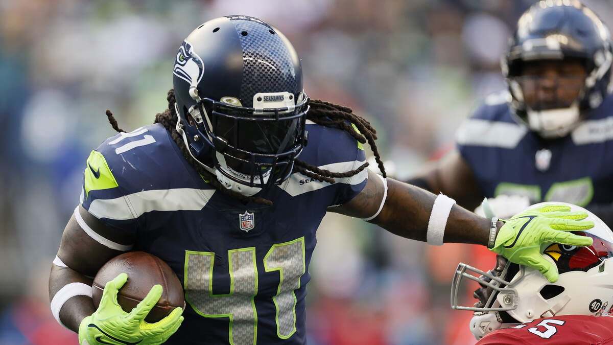 SEATTLE, WASHINGTON - NOVEMBER 21: Alex Collins #41 of the Seattle Seahawks avoids a tackle by Chandler Jones #55 of the Arizona Cardinals during the third quarter at Lumen Field on November 21, 2021 in Seattle, Washington. (Photo by Steph Chambers/Getty Images)Photo: Getty Images
