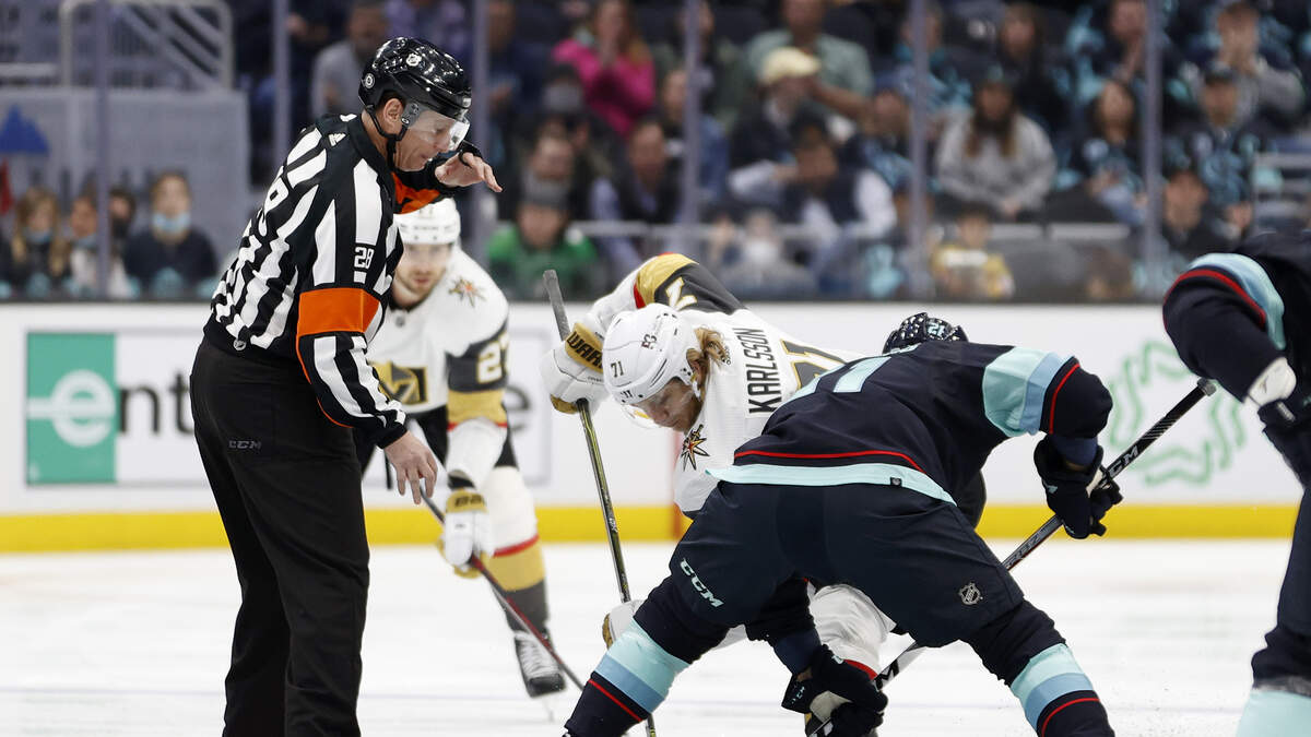 SEATTLE, WASHINGTON - MARCH 30: William Karlsson #71 of the Vegas Golden Knights and Alex Wennberg #21 of the Seattle Kraken take the opening face off at Climate Pledge Arena on March 30, 2022 in Seattle, Washington. (Photo by Steph Chambers/Getty Images)Photo: Getty Images